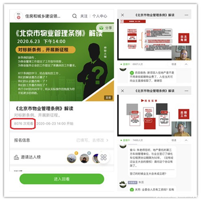 随着城市的发展,物业服务行业是现代生活的重要组成部分,北京市目前已有3500余家物业服务企业,物业项目达7000余个。据统计,12345热线反映物业管理类的问题单日突破2万余件,这就从侧面说明与物业管理毗邻关联的问题直接引起了民众的关注。《北京市物业管理条例》(以下简称《条例》)于2020年5月1日正式施行。为助力物业行业企业学习和把握新的政策法规,厘清物业管理边界,必威手机网页版官网于2020年6月23日下午2:00特别邀请北京市物业管理行业专家史文军、朱芸对《北京市物业管理条例》进行了在线公益解读,得到了社会各界的热情关注,点击量突破8000人次。